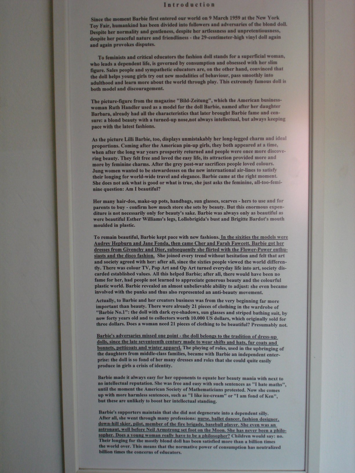 Click the photo below to view an interesting article on Barbie which was displayed with the dolls.