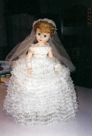 Years later when Nancy got married her mother decided that she should have the doll. However, at that point Nancy was not really interested in displaying it in her home, so the doll stayed in her mother's house. (I guess it was a little to late to warm up to a doll she was not allowed to touch.) Later, when her mother moved, the glass case broke. After that, Nancy's mother periodically would tell Nancy that she had "her bride doll" to take home. Nancy always "conveniently" forgot to take it with her. Over time, Nancy had two sons and then a daughter. After her daughter was born, Nancy's mother reminded her that she could pass the bride doll on to her. Although it seemed like a neat idea, she did not want to give her daughter the doll and tell her that she could only look at it (like a dog salivating over a treat!) Finally one day Nancy went to her mother's house and she said, "Here, I packed up your doll for you to take home." So now the doll lives with Nancy. She's no longer in her glass case, but is wrapped up in her closet. Nancy says someday her daughter will be lucky enough to take the doll home with her.