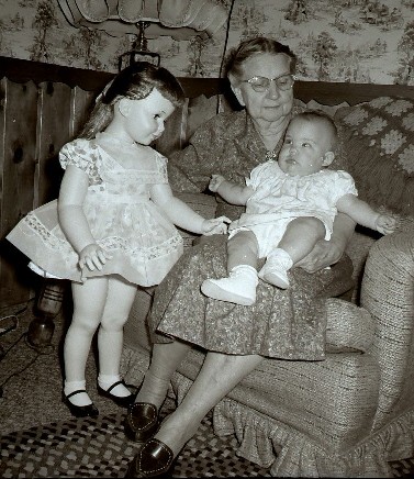 The photo above was sent in to me by Liz from California. It was taken on her first Christmas in 1960. Her Grandma Sharp is holding her and standing next to them is a beautiful Patti Playpal doll. Wow, Patti almost looks like a real little girl in this photo! Liz hopes to someday find a replacement for this doll. Good luck Liz and thanks so much for sharing the great photo! Click here to see my "Patti Playpal" page.