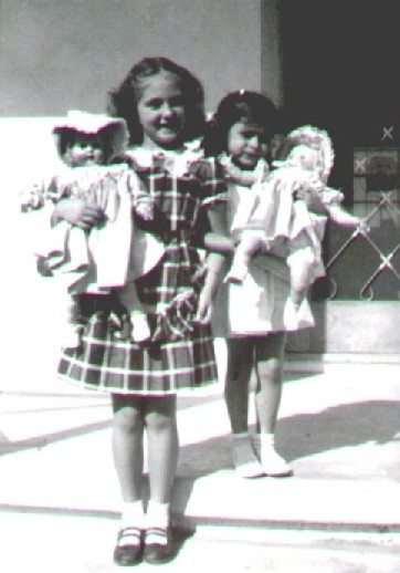 The photo above was sent in to me by Wendy. She is the little girl in the plaid dress on the left. Wendy believes this photo was taken on Christmas day 1951 or 1952. She was visiting a friend of the family for the day and this photo was taken of her and the friend's daughter with their brand new dolls! (Note that both dolls look very much alike.) Wendy remembers this doll as having a cloth body and a composition or hard plastic head with a smiling open mouth. She had blond hair and her coat and hat were made from a dusty pink broadcloth fabric with white lace trim. Wendy is wondering if anyone knows the name or manufacturer of this doll. I did some research and believe she may be an Ideal "Tickletoes" or Ideal "Deluxe Baby Beautiful" that were made around 1950/1951. Wendy also notes that her father worked for Goodyear Tire and Rubber and most likely the doll was purchased at the toy store run by that company at the time. If anyone has more information on this doll, please e-mail me at the link below so I can pass this information on to Wendy. Thanks so much Wendy for sharing your photo and information about your doll! Hope you find another one like her someday!